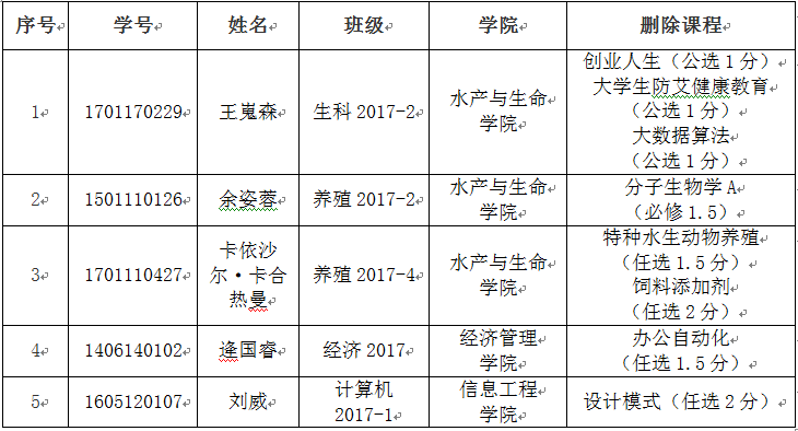 教务处对全校学生的选课学分情况进行审核,截止到目前,仍然有部分学生未办理退课手续,根据通知要求,我们随机删除其部分课程并予以通告,请学院务必通知到学生本人。具体情况如下: